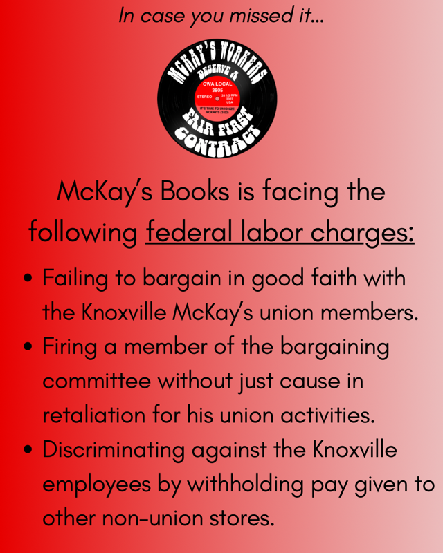VISIT KNOXVILLE MCKAY'S WORKERS UNION INSTAGRAM FOR ADDTIONAL INFORMATION